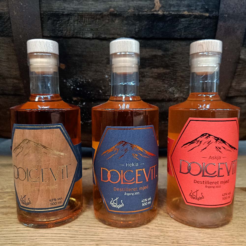 Dolcevit samlerpakken er en fortælling om tid, omtanke og respekt for råvaren. Den rummer tre forskellige udgaver af destilleret mjød – Katla, Hekla og Askja, som tilsammen viser bredden og dybden i vores arbejde med mjødens sjæl og spiritussens styrke.